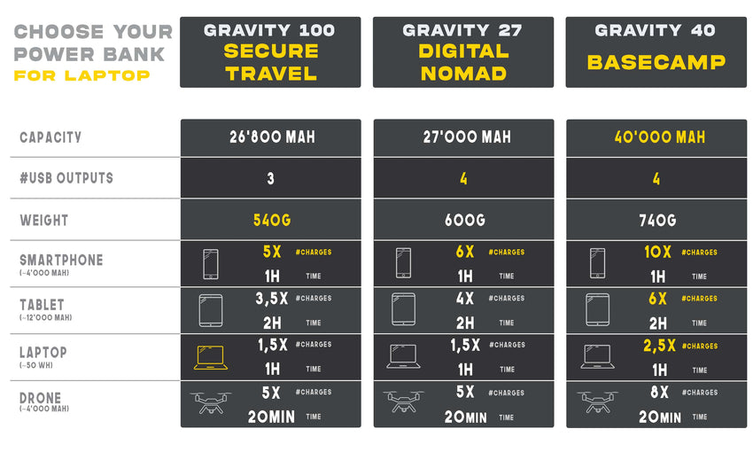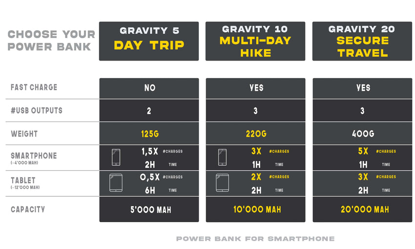 Our Portable Power Bank Gravity series is designed for those who prioritize mobility without compromising on power. With options ranging from 5000mAh to 40000mAh, you can find the perfect balance between capacity and portability.