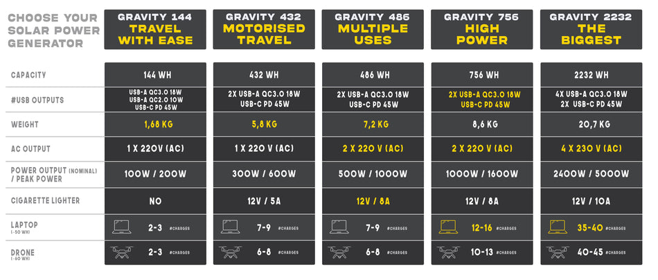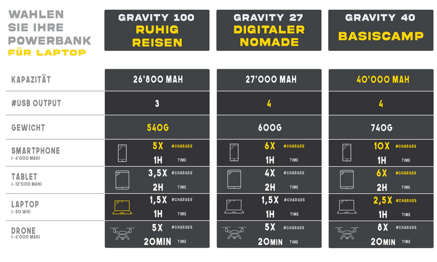 Sunslice bietet 3 tragbare externe Laptop-Akkus an. Den Gravity 100, den Gravity 27 und den Gravity 40. Ihre Eigenschaften, wie Kapazität, Leistung und Ladeprotokoll, unterscheiden sich, um eine Ladelösung für alle Arten von Laptops zu gewährleisten. Es ist also wichtig, diese Unterschiede zu verstehen, bevor Sie Ihre Wahl treffen.
