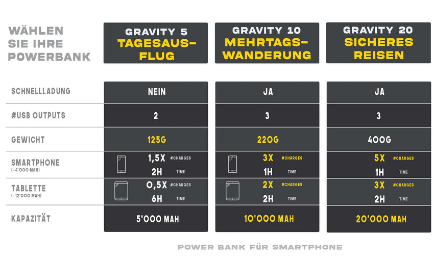 Unsere tragbare Power Bank Gravity wurde für alle entwickelt, die Wert auf Mobilität legen, ohne Kompromisse bei der Leistung einzugehen. Mit Optionen von 5000mAh bis 40000mAh finden Sie die perfekte Balance zwischen Kapazität und Tragbarkeit.