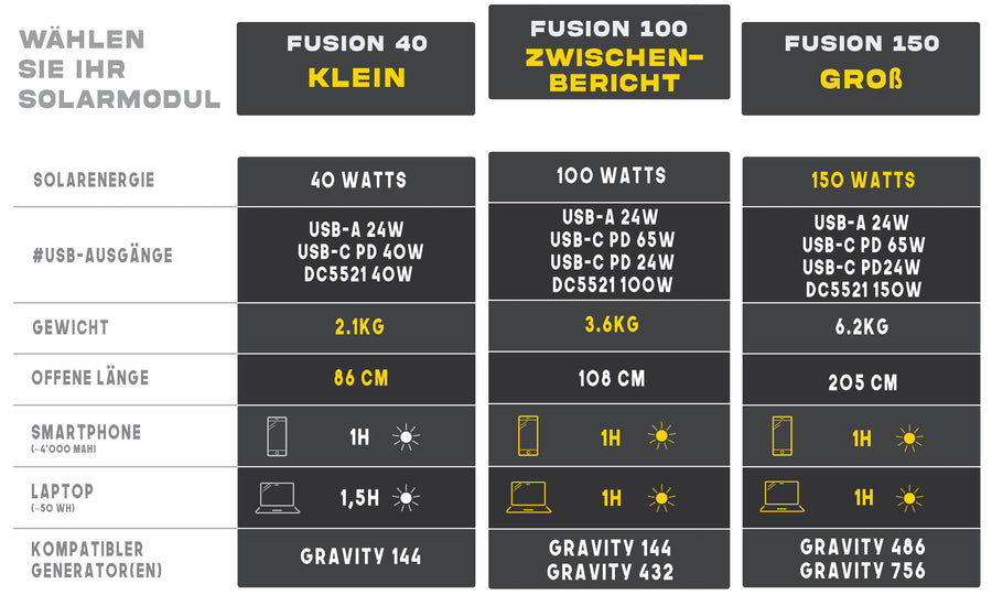 Der Fusion 100 ist mit den Kraftwerken Gravity 144 und Gravity 432 kompatibel. Diese Kombination ermöglicht es Ihnen, die von der Sonne erzeugte Energie zu erhöhen. Wie?