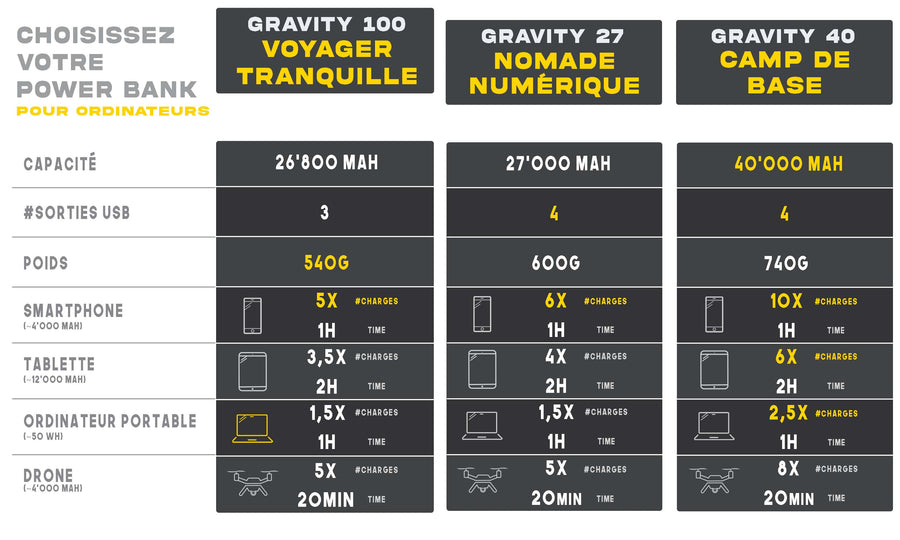 Le Gravity 100 ne pèse que 540g, ce qui est imbattable pour un powerbankune capacité de 26'800 mAh.