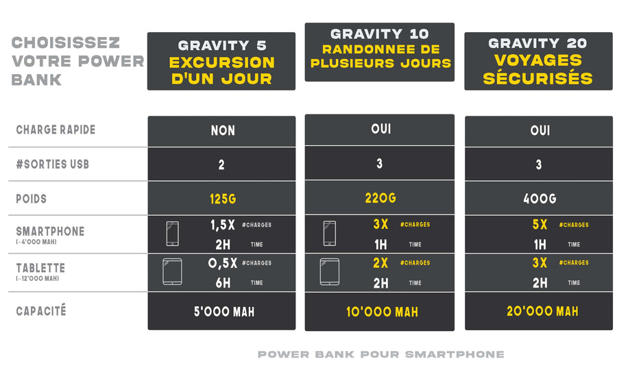 La Gravity 10 a une capacité de 10 000 mAh. Cela signifie qu'elle peut charger jusqu'à 3 smartphones en un seul cycle.