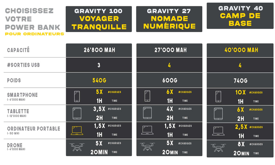 Le Gravity 40 ne pèse que 740 g, ce qui est très léger pour un powerbankune capacité de 40 000 mAh.