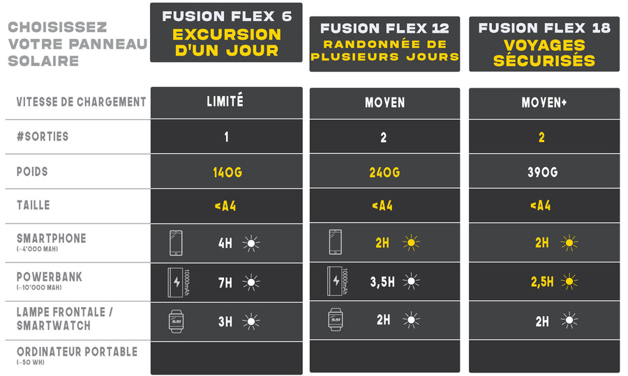 Le panneau solaire Fusion Flex 6 ne craint ni les chocs, ni les éraflures, ni la poussière, ni l'eau, ni le sable, ni d'être plié. Vous pouvez donc l'emporter pour toutes vos aventures !