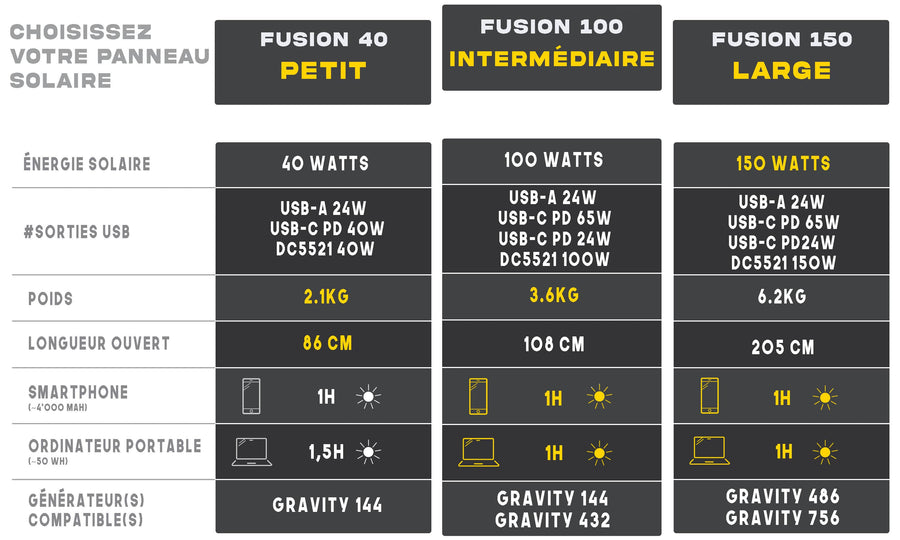 Le Fusion 100 rechargera le Gravity 144 en environ 2 heures en plein soleil.