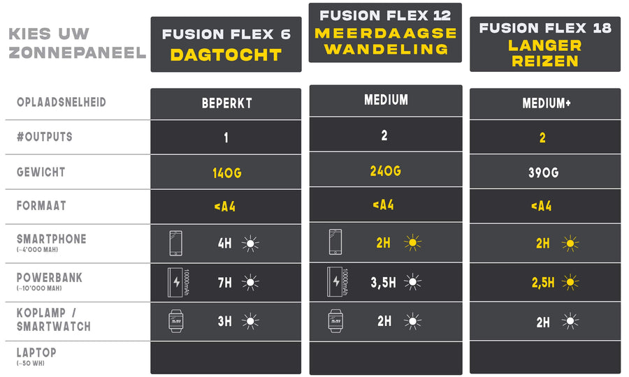 Met een gewicht van slechts 270 gram en opgevouwd tot een klein A4-formaat is de Fusion Flex 12 zonnelader perfect voor kampeerders, wandelaars en fietsers die een hoog vermogen willen, maar het gewicht dat ze dragen tot een minimum willen beperken.