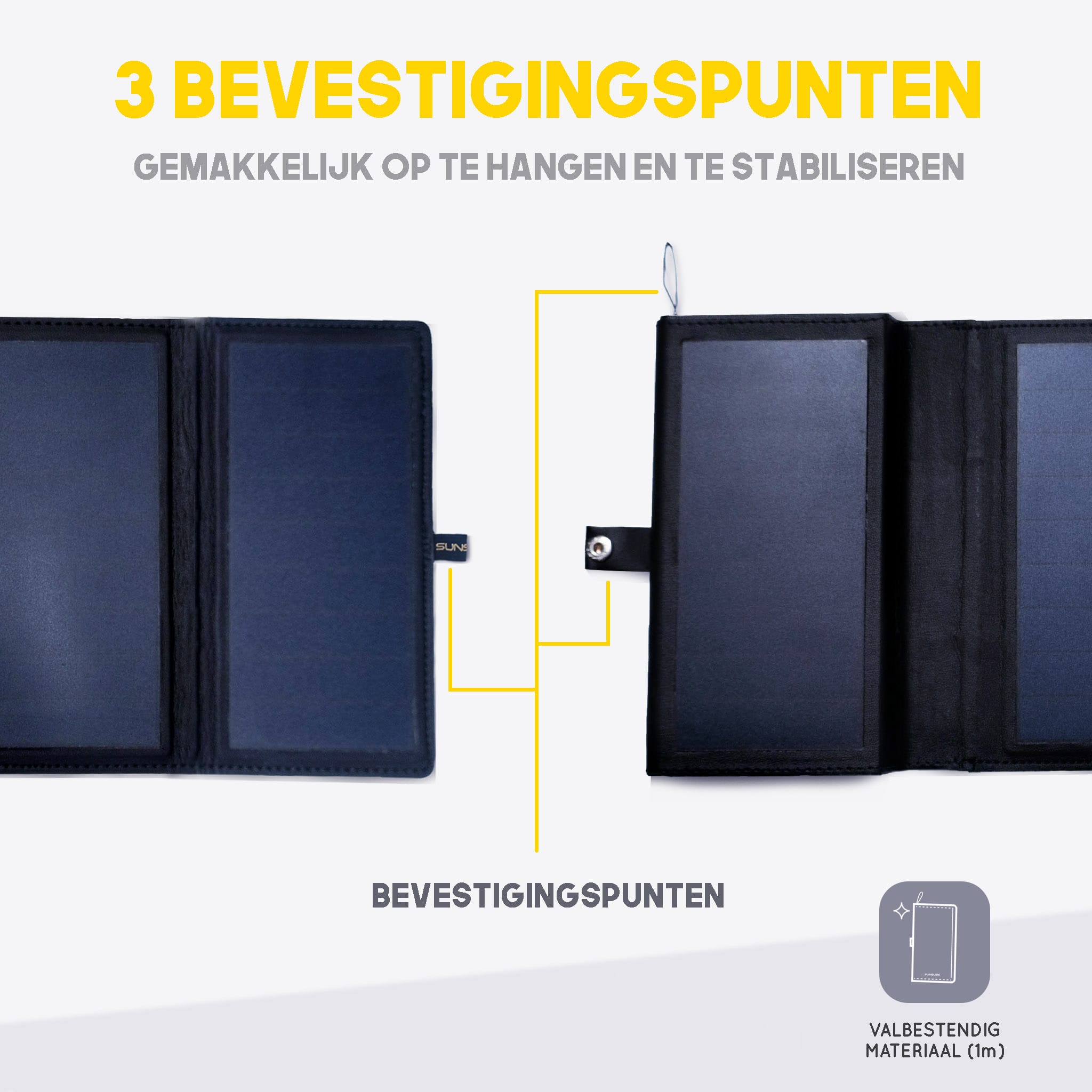 Het is uitgerust met 5 zeer efficiënte zonnepanelen en een geïntegreerde krachtige powerbank en zorgt zo voor het super snel opladen van al je apparaten tijdens het wandelen en kamperen in de outdoors.