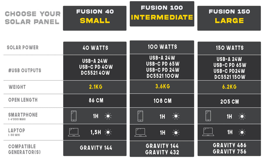 The combination of the Fusion 100 solar panel with the Gravity 144 or 432 portable power stations are perfect solutions for anyone looking to power multiple electronic devices off the grid. A 5m extension cable is included with the Fusion 100. The generators can thus be charged far away from the solar panel.