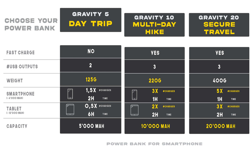 The Gravity 5 has a 5'000 mAh capacity. This means that it can charge up 1 to 2 smartphones in 1 cycle.